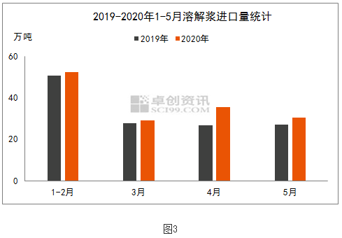 進口木漿價低量足:如圖2所示,進口闊葉溶解漿外盤走勢基本與國產溶解漿同步,2019年四季度紙2020年一季度持穩于630美元/噸附近,根據當時人民幣匯率計算,一季度闊葉進口成本在5050-5200元/噸;二季度因人民幣匯率持續貶值,進口成本增加,粘短廠家壓價采買,闊葉漿外盤連續下調至610美元/噸,二季度闊葉漿進口成本進口成本在5000-5230元/噸。由此可見進口溶解漿價格一直低于國產闊葉漿,粘短廠家傾向采買外盤來降低成本。那進口溶解漿供應情況又怎么樣呢,如圖3是近兩年1-5月進口量對比圖,可以看到2020年各月進口量均多于2019年,前五個月進口量148萬噸,同比增長12%,進口漿價低量足擠壓國產溶解漿銷售空間。