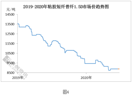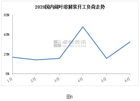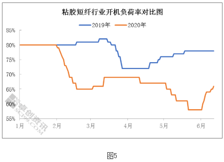 粘短開工率低于同期:如圖5所示,2020年粘短行業開工負荷明顯低于去年同期,一季度主要受國內公共衛生事件和春節假期影響,二季度則是市場需求收緊,且價格走低,開工偏弱整理,溶解漿消耗量減少,采買周期延長。