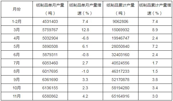 2019年1-11月中國紙制品產(chǎn)量及增速統(tǒng)計表