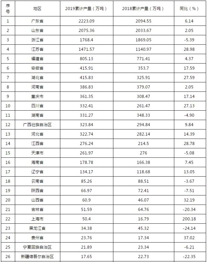 按行政區(qū)域劃分,2019年,廣東省實(shí)現(xiàn)產(chǎn)量2223.09萬噸,同比增長(zhǎng)6.14%,排名************,山東省2075.36萬噸,同比增長(zhǎng)2.05%,排名第二。產(chǎn)量超過1000萬噸的省份還有浙江和江蘇。四個(gè)省份產(chǎn)量合計(jì)占到全國總產(chǎn)量的60%。增速比較快的省份包括上海、貴州、山西、江西、湖北、江蘇和四川。